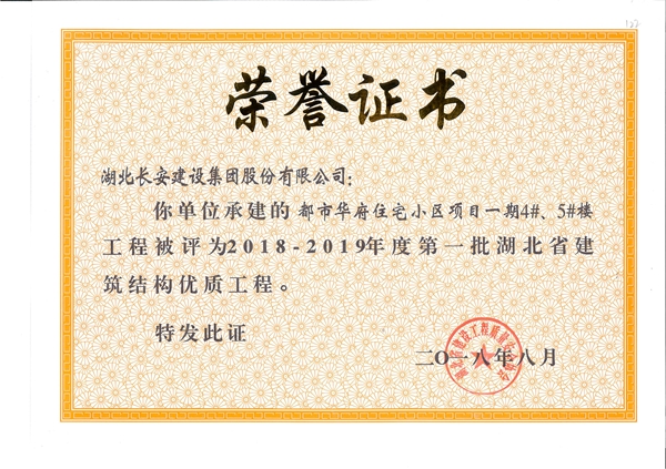 都市華府住宅小區(qū)項目一期(4#、5#)樓工程被評為2018-2019年度第一批湖北省建筑結(jié)構(gòu)優(yōu)質(zhì)工程