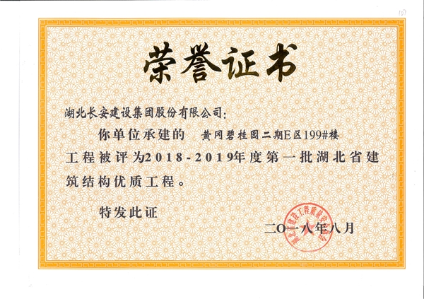 黃岡碧桂園二期E區(qū)199#樓工程被評為2018-2019年度第一批湖北省建筑結(jié)構(gòu)優(yōu)質(zhì)工程