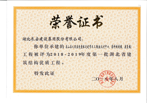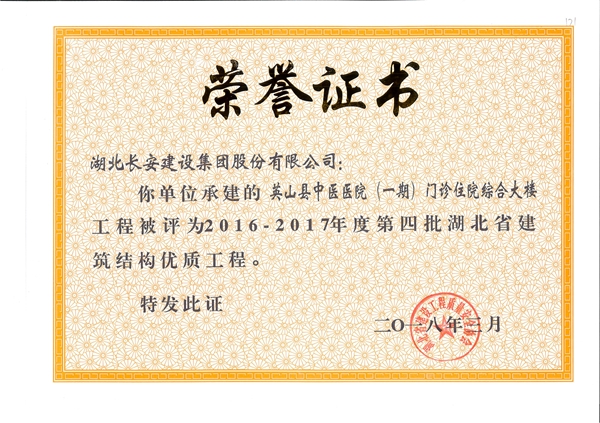 英山縣人民醫(yī)院整體遷建項目三期(放化療中心、藥科制劑樓、康復(fù)樓)工程被評為2018-2019年度第一批湖北省建筑結(jié)構(gòu)優(yōu)質(zhì)工程