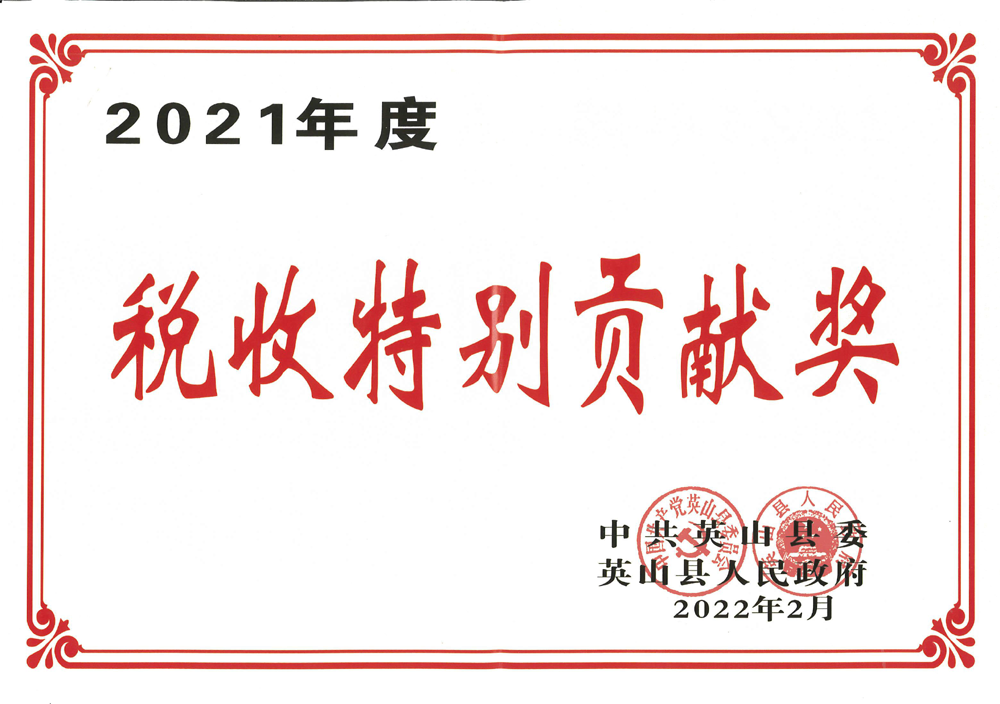 2月9日,中共英山縣委、英山縣人民政府授予集團“2021年度稅收特別貢獻獎”,集團連續(xù)10年穩(wěn)居“英山縣第一納稅大戶”榜首。