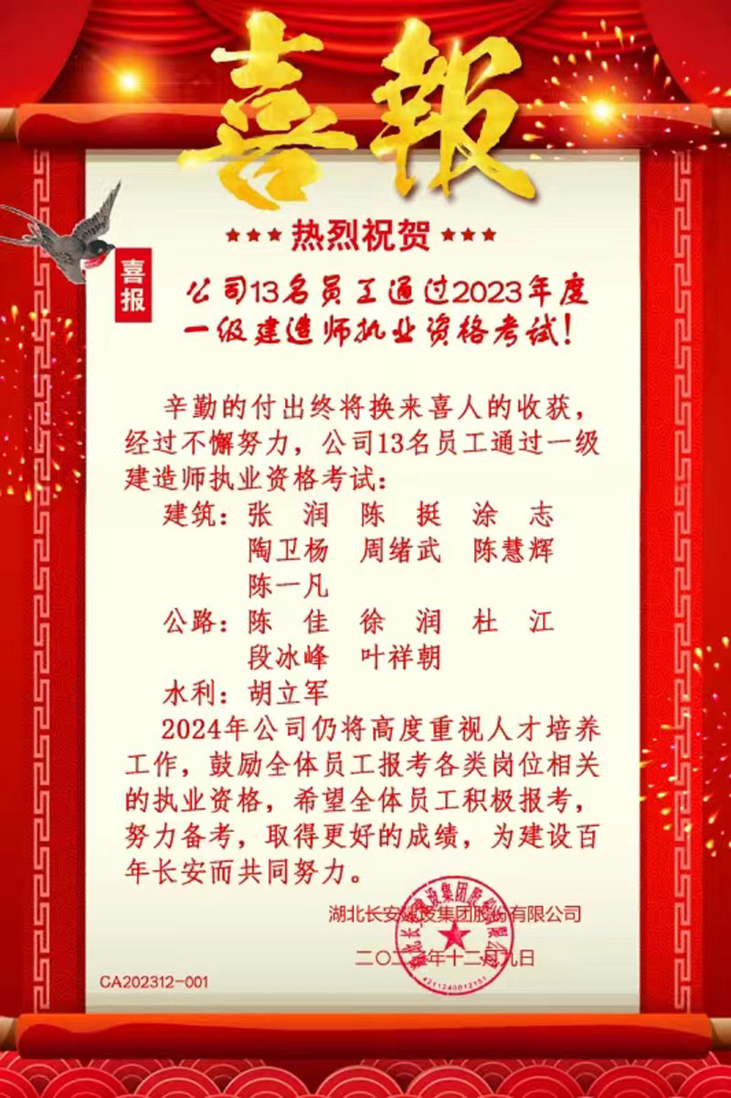 13名員工通過2023年度一級建造師執(zhí)業(yè)資格考試