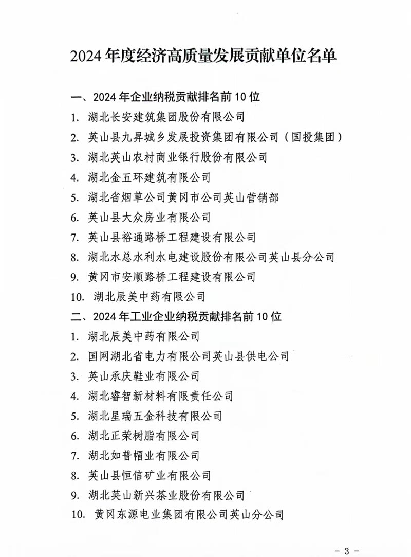 2月10日,英山縣2025年三級干部會議在英山縣禮堂召開。集團(tuán)公司榮庸“2024年度經(jīng)濟(jì)高質(zhì)量發(fā)展貢獻(xiàn)單位”稱號,在“2024年企業(yè)納稅貢獻(xiàn)排名前10位”中榮居第1位。