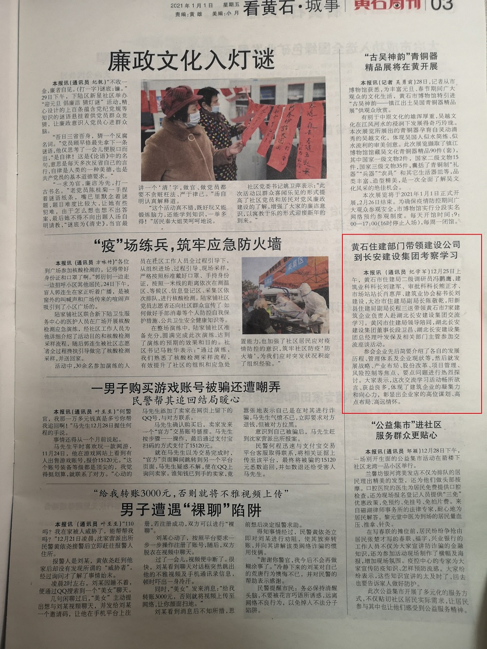 為加強(qiáng)住建系統(tǒng)的企業(yè)交流合作,共同促進(jìn)建筑業(yè)高質(zhì)量發(fā)展,12月25日上午,黃石市住建局二級調(diào)研員馮鵬鷹、建筑業(yè)科科長劉建軍、審批科科長熊正才、市場站站長肖惠萍、建筑業(yè)協(xié)會秘書長劉建設(shè),大冶市住建局副局長陳敬乾,陽新縣住建局副局長程三送帶領(lǐng)黃石市7家建筑企業(yè)負(fù)責(zé)人赴湖北長安建設(shè)集團(tuán)交流學(xué)習(xí)。黃岡市住建局總工劉俊、建筑業(yè)科科長徐宏、英山縣住建局局長黃威陪同。湖北長安建設(shè)集團(tuán)董事長段衛(wèi)昌、總經(jīng)理葉發(fā)保及相關(guān)部門主管參加交流座談活動。